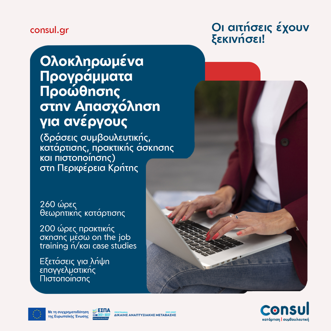 Ολοκληρωμένα Προγράμματα Προώθησης στην Απασχόληση για ανέργους (δράσεις συμβουλευτικής, κατάρτισης, πρακτικής άσκησης και πιστοποίησης) στη Περιφέρεια Κρήτης